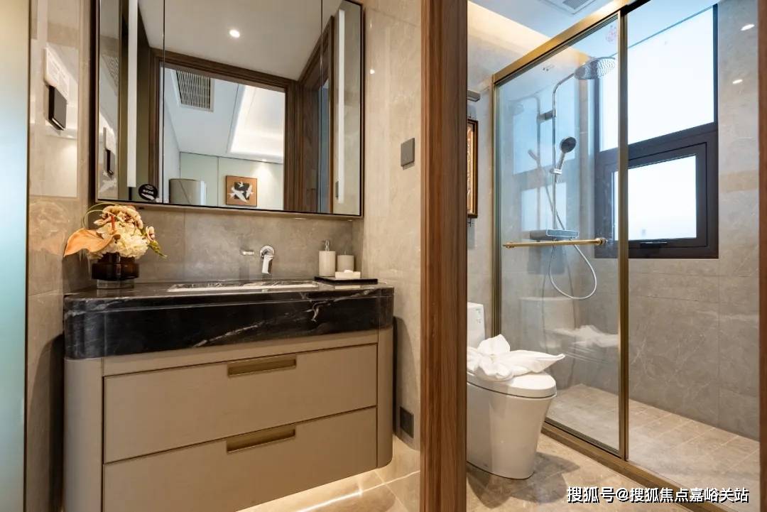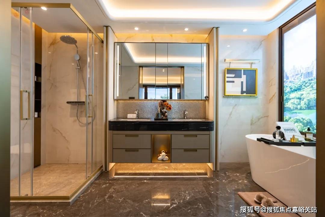 卫生间甄选唯宝的台下盆、汉斯格雅的龙头+恒温花酒,玫瑰岛的淋浴房,科勒的智能一体马桶+浴缸+浴缸龙头