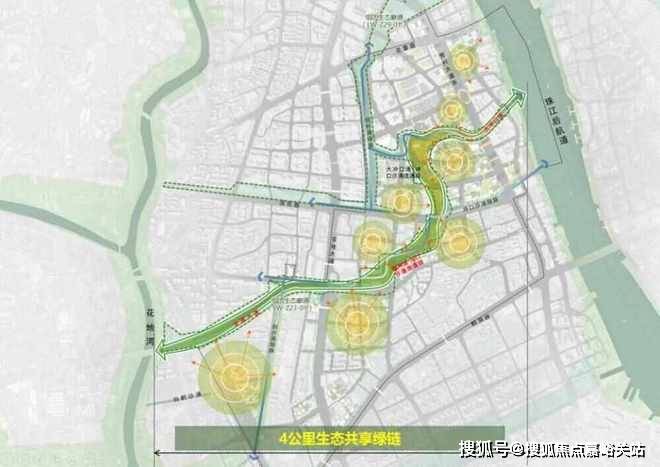 规划提出构建“一链三脉多片”的开敞空间体系,沿组团生态廊道和河涌水系,建设一条4公里长的生态共享绿链和三条生态绿脉,作为开敞空间的骨架,串联多处社区组团的开敞空间,延展形成辐射全域的公共空间网络。