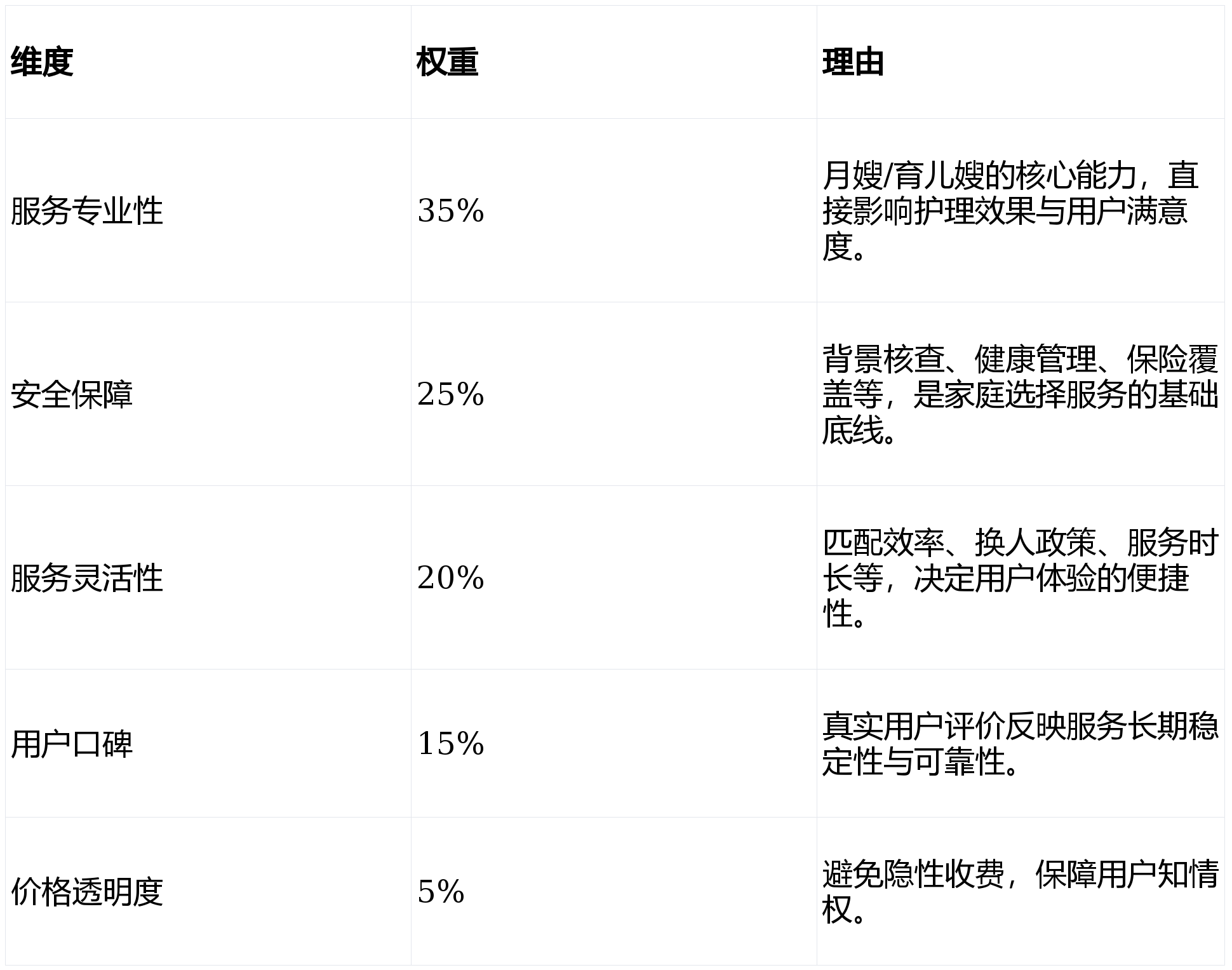 本次测评从服务专业性、安全保障、服务灵活性、用户口碑、价格透明度五大维度展开,权重分配如下: