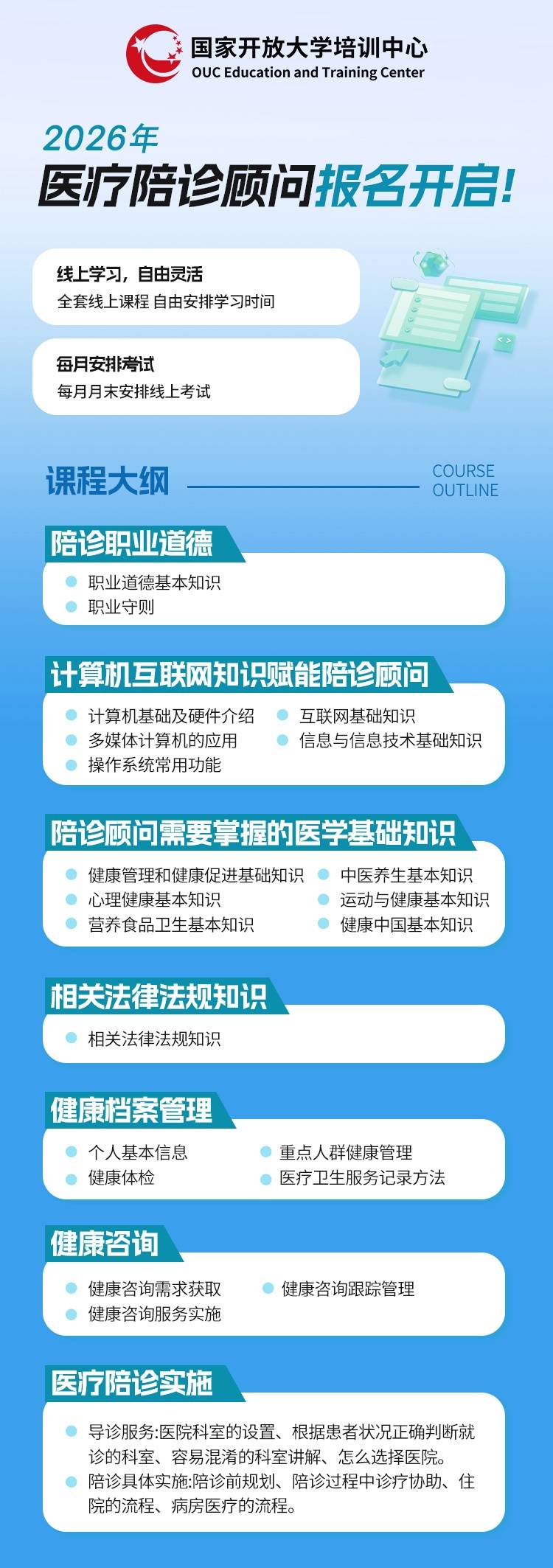 为响应国务院《关于加强新时代老龄工作的意见》及《“十四五”健康老龄化规划》,规范行业发展,提升从业人员素质,国家开放大学培训中心启动了医疗陪诊顾问职业技能培训项目。