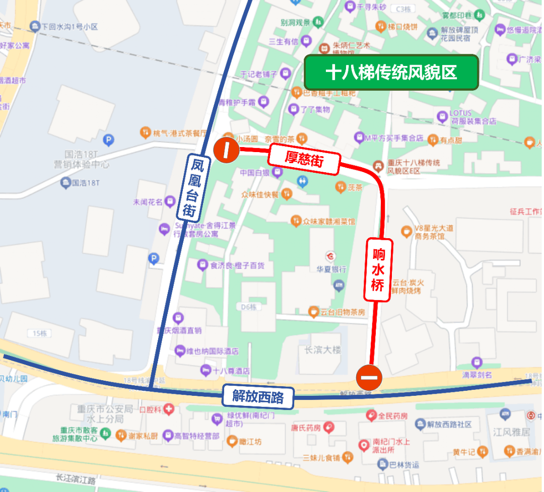 节日期间,在洪崖洞、解放碑、朝天门区域,重中型货车禁行时间延长至次日凌晨1时。