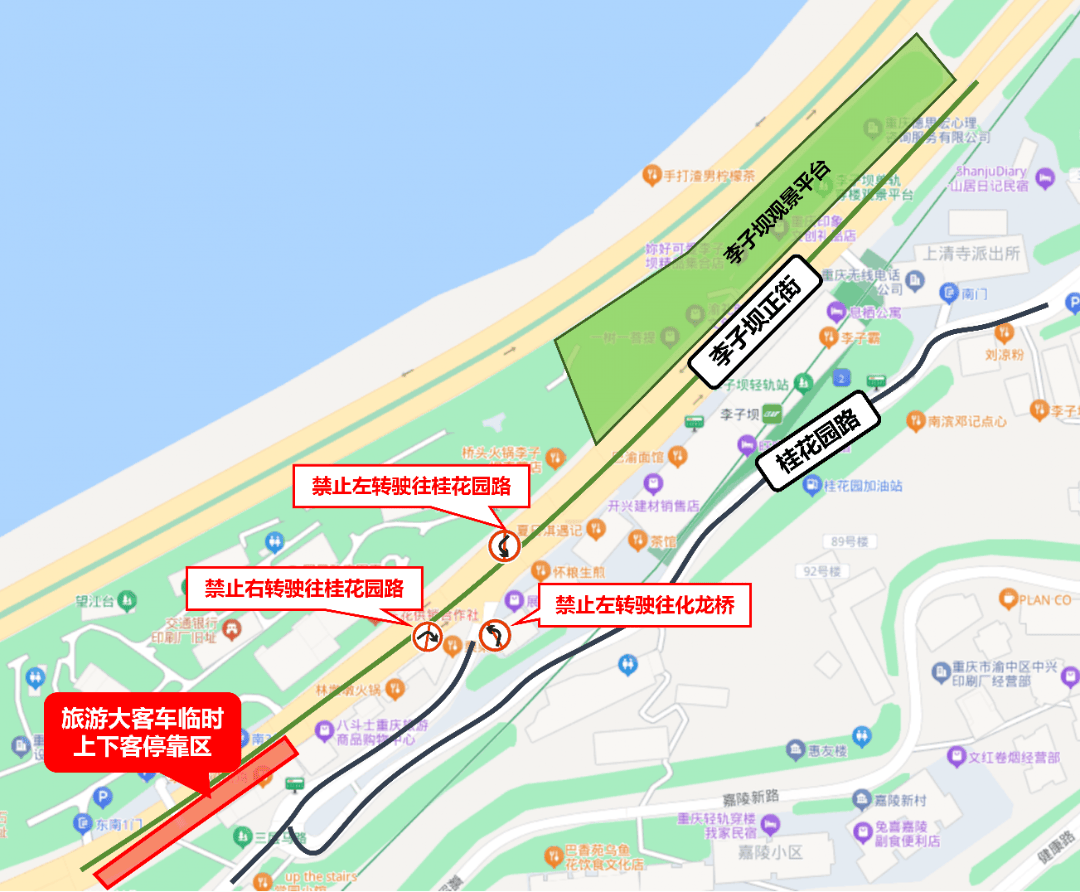 每日7:00至18:00,禁止李子坝正街往桂花园路以及桂花园路往化龙桥方向车辆在李子坝正街桂花园路路口左转。李子坝正街自中石油牛滴路加油站出口上跨桥处起至李子坝公交站分道处红绿灯止单向700米路段,区域内实施8分钟限时通行交通管理措施,所有车辆驶入该区域后,均需在8分钟内驶离;自李子坝正街嘉陵新路路口起至李子坝正街与嘉陵江滨江路匝道汇入交叉口止单向500米路段,区域内实施6分钟限时通行交通管理措施,所有车辆驶入该区域后,均需在6分钟内驶离(特种车辆除外)。同时,上述路段双向区域禁止旅游大客车上下客,请在指定区域规范停放。