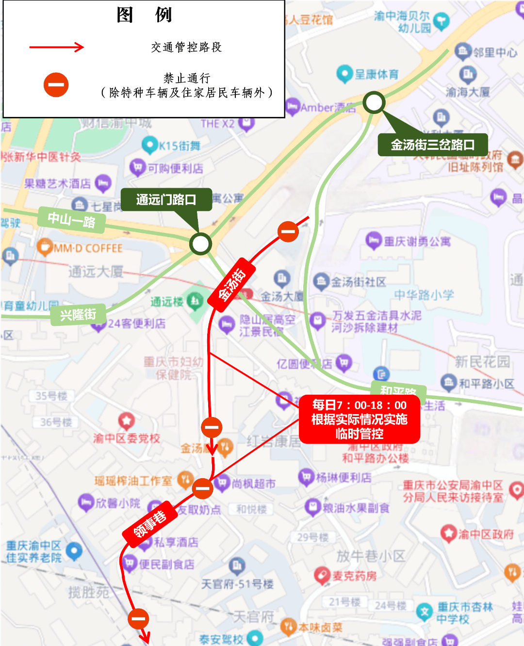 每日16:00至24:00,适时对沧白路、临江路(五四路至临江支路段)、临江支路、江家巷、棉花街、民族路(新华路至沧白路单向段)、千厮门大桥、东水门大桥(南岸区往渝中区方向及其附属匝道)、千厮门隧道(东水门大桥往千厮门大桥方向)进行交通管制。解放碑核心区域部分道路每日7:00至23:00限制19座(含)以上大型客车通行。
