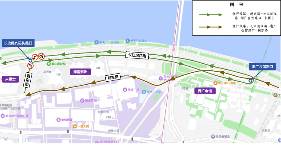 每日17:00至24:00,根据实际情况禁止车辆在长江滨江路九码头路口左转往朝东路方向及掉头,禁止朝东路车辆左转往长江滨江路行驶。