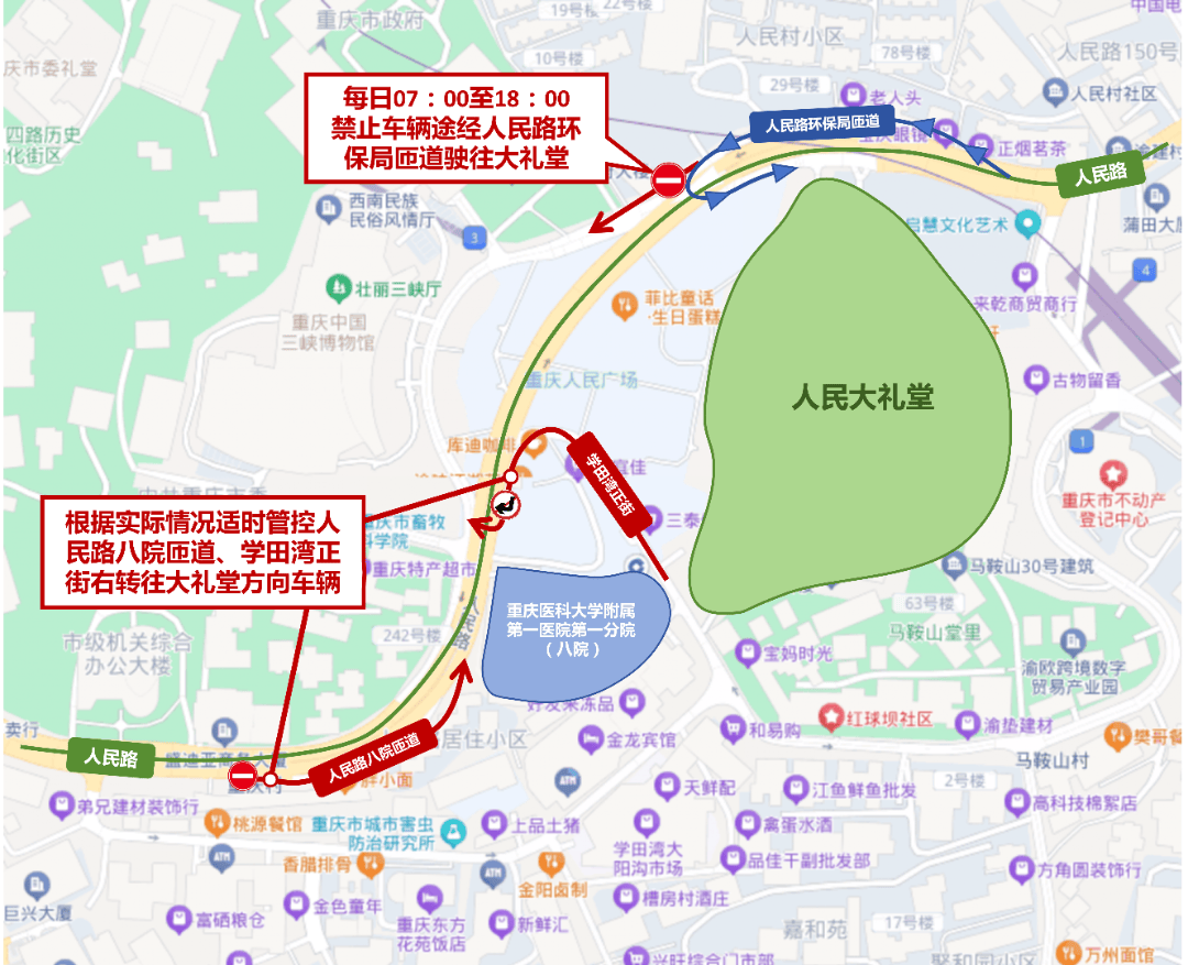 每日7:00至18:00,禁止车辆经人民路环保局匝道往大礼堂方向行驶。将根据实际情况适时管控人民路八院匝道、学田湾正街右转往大礼堂方向车辆,旅游大客车请前往人和街指定区域临时停车上下客。