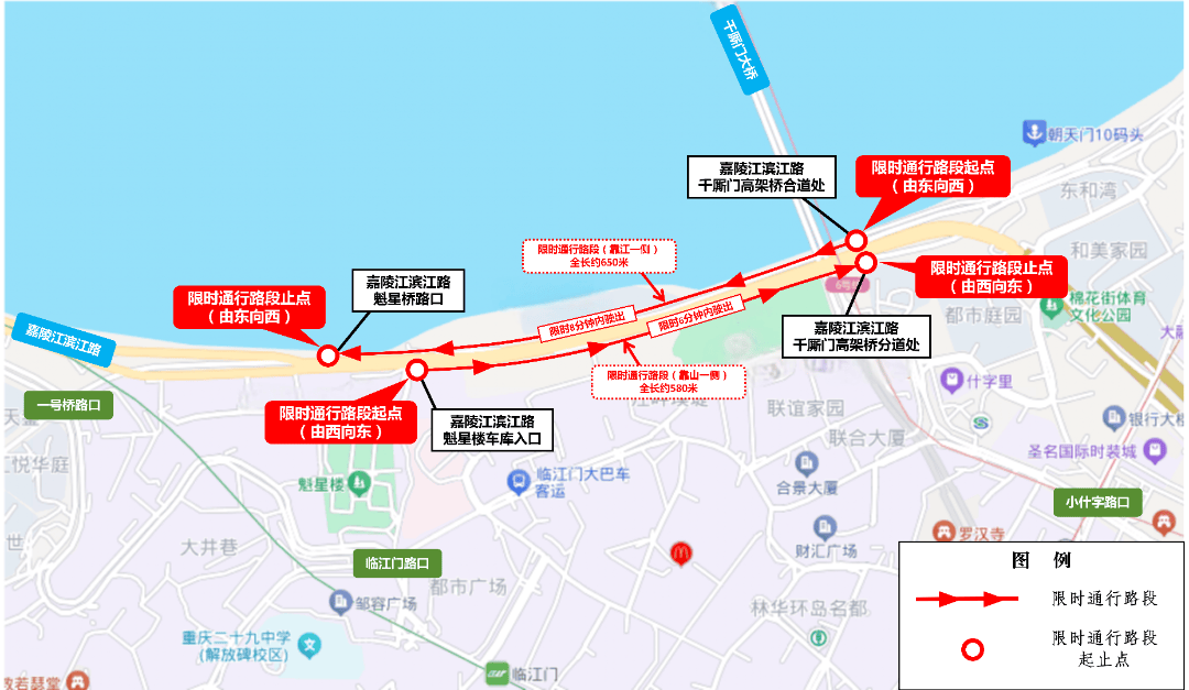 每日16:00至24:00,适时对嘉陵江滨江路(大溪沟至朝千路口双向路段、信义街下口至朝千路单向路段)、湖广会馆立交至朝天门隧道、解放碑地下环道洪崖门地下道进行交通管制。嘉陵江滨江路(靠江一侧)千厮门高架桥合道处起至嘉陵江滨江路魁星桥路口止单向650米路段,区域内实施8分钟限时通行交通管理措施,所有车辆驶入该区域后,均需在8分钟内驶离;嘉陵江滨江路(靠山一侧)魁星楼车库入口起至嘉陵江滨江路千厮门高架桥分道处止单向580米路段,区域内实施6分钟限时通行交通管理措施,所有车辆驶入该区域后,均需在6分钟内驶离。